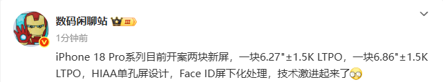 据悉,iPhone 18 Pro系列工程机正测试两款新型显示屏:分别为6.27英寸和6.86英寸,均采用1.5K分辨率LTPO面板,延续HIAA(激光直接成型)单孔设计,并首次实现Face ID组件的屏下化集成。这一技术升级标志着苹果在屏幕形态上迈出突破性一步。